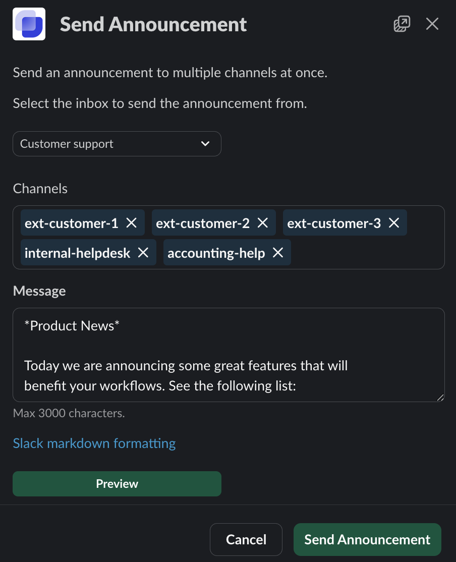 With our new **Announcement** feature, you can now broadcast messages directly to multiple Slack channels with just a few clicks. This is perfect for sharing: