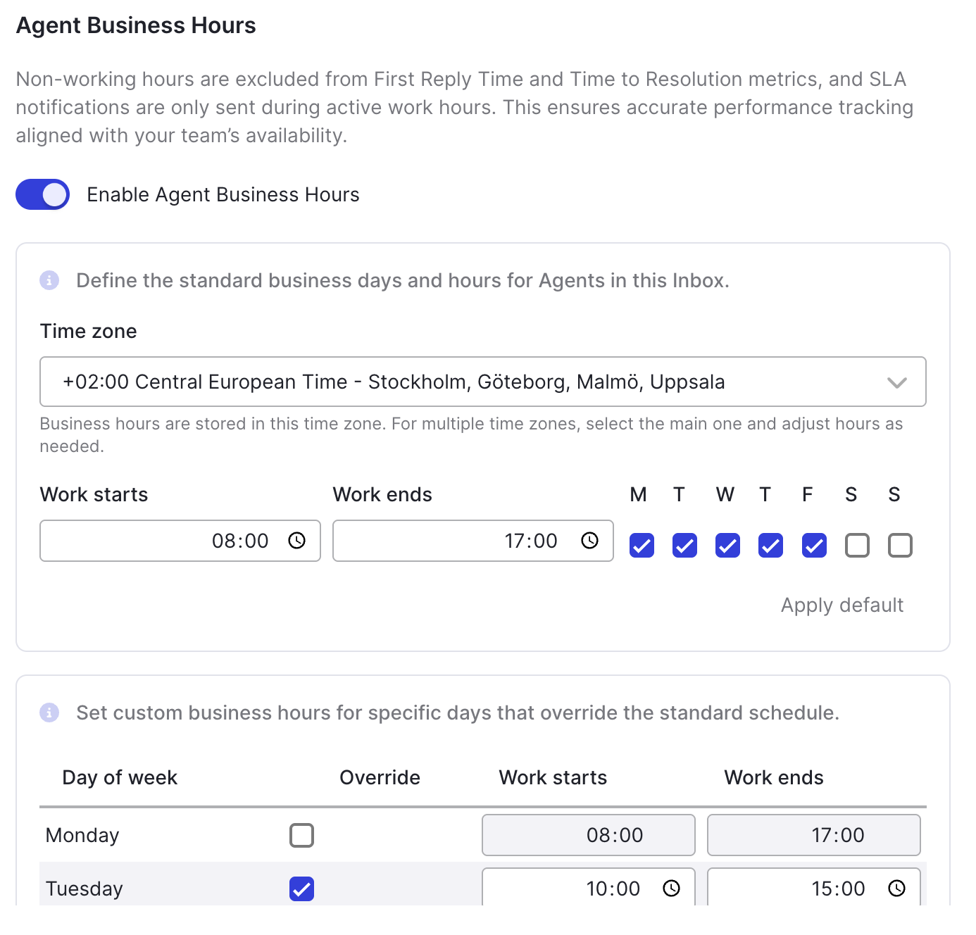 Each inbox can be configured with business hours for your Agents:&#x20;